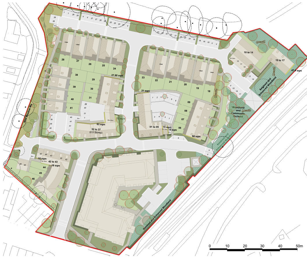 The newly legislated Biodiversity Net Gain requirments gave us an opportunity to interweave a fuctional ecosystem alongside generous amenity - a bioswale along the west of the site along with extensive tree planting and nature-rich planted buffers.