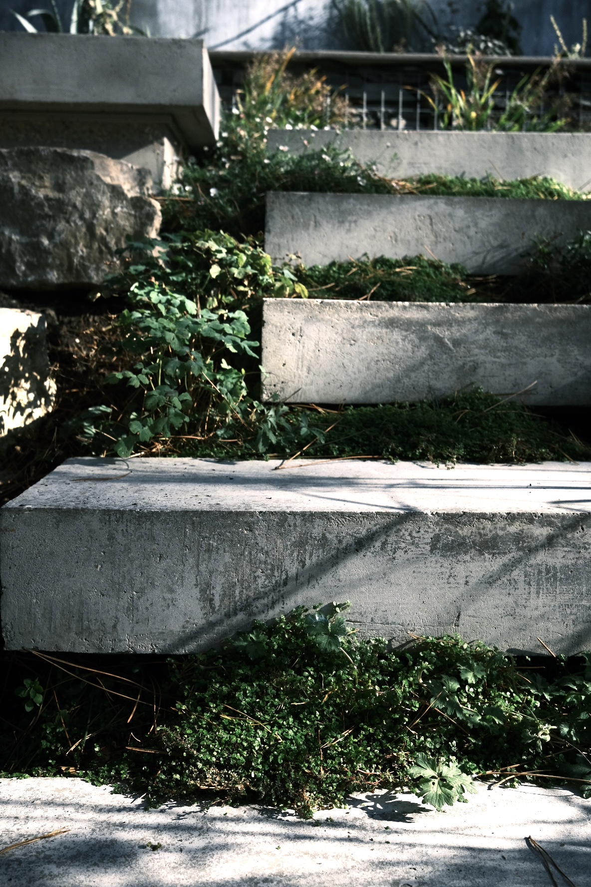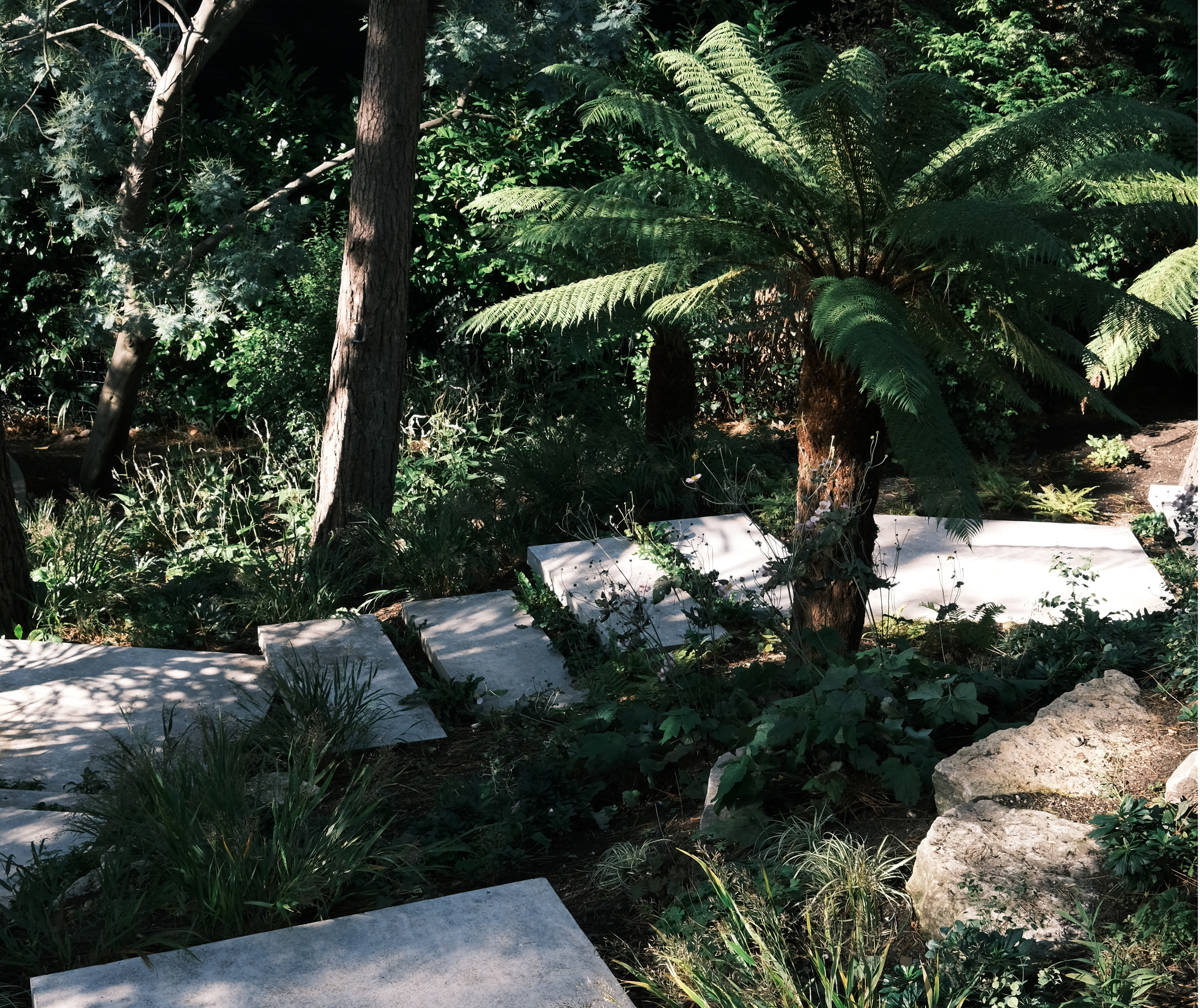 Custom poured slabs of etched concrete float across the garden, creating stepping stones through the woodland.