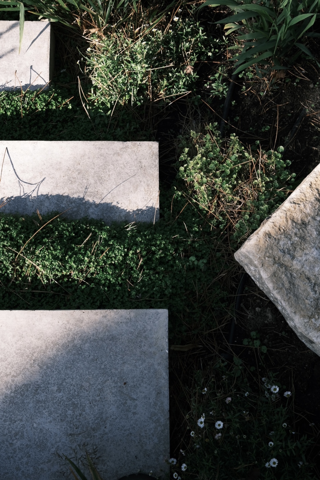 The paving tiptoes through the garden, creating pathways down the hillside and leading to hidden covered decks and at the far end a boules court with views across the valley, a sunny spot to while away an afternoon. Boulders shore up the slopes and provide stepping stones for the more adventurous.